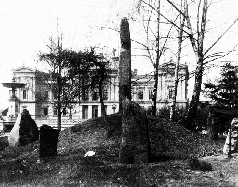 På föreningens andra allmänna möte, i oktober 1866, väckte sekreteraren förslag om att föreningen skulle söka samla alla sådana runstenar inom de skånska landskapen, som flyttats från sina ursprungliga platser och på sin nuvarande plats var utsatta för fara att lida skada eller rent av förkomma. Enligt förslaget borde dessa föras till Lund, "de skånska landskapens gamla historiska medelpunkt", och där uppställas till säkert förvar för framtiden. Sedan Kungl. Vitterhets-, historie- och antikvitetsakademien givit sitt tillstånd, sattes planen i verket. Lunds universitet upplät för ändamålet ett hörn av den dåvarande botaniska trädgården, d. v. s. den nuvarande universitetsplatsen. De skånska landskapens historiska och arkeologiska förening lät här resa en hög och uppställde där inte mindre än sju runstenar från olika delar av Skåne. Utan jämförelse ståtligast var den högresta s.k. Helgonastenen, som år 1690 uttogs ur muren på det då raserade Allhelgonaklostret och senare flyttades till Lundagård, där den sedan 1750 - sönderslagen i tre delar - legat framför ingången till Lundagårdshuset. På föreningens bekostnad reparerades nu stenen och restes, på runstenshögen. För några år sedan, 1957, flyttades den till Universitetsbiblioteket, där den nu står i hallen - på samma plats, där den för 400 år sedan återfanns.